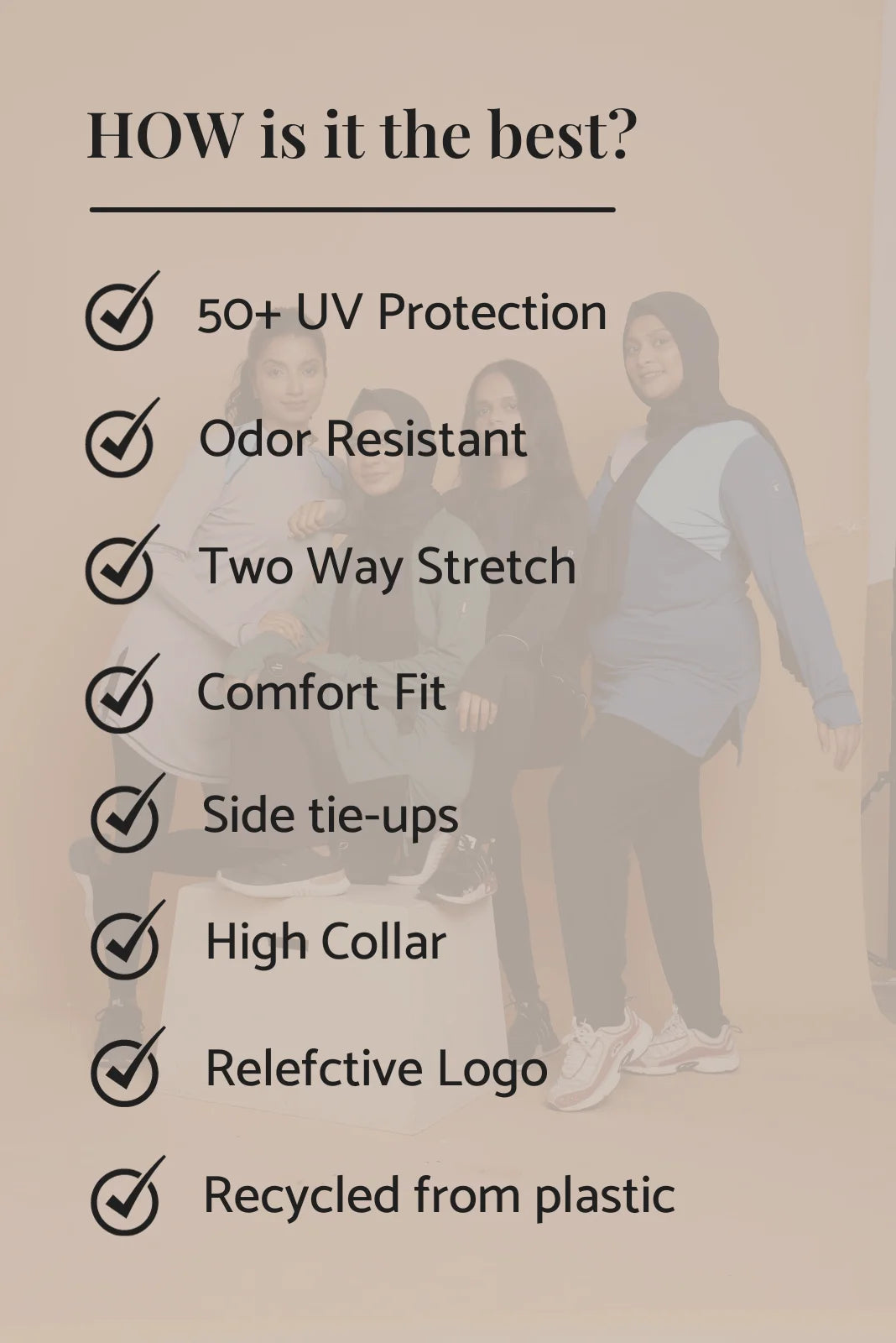Nemah’s Modest Tshirt is designed, keeping Comfort & Islamic Clothing criteria in mind, for your next performance-focused workout that is durable and functional. Our Athena Modest Activewear T-shirt is an innovative tailor-made apparel that feels like your second skin. Made with lightweight fabric that moves with you using its 4-way stretch, odor-resistant technology with UV protection, and a durable flat lock stitch with a pocket to eliminate all obstacles for your performance-focused workout. It cannot get any better, an investment that allows you to #FocusOnYou.